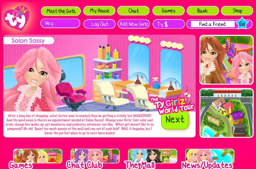 Games looks like a "Coney Island" or "Great Adventure" site. There it says, "Check out our fantastic arcade where you can try games of skill and knowledge! Test your memory with Match Girlz or try a fun puzzle game like Jewel Jam! Earn lots of Ty Dollars that you can spend at the Mall or put in the Bank to save and buy something later! And speaking of the bank..."